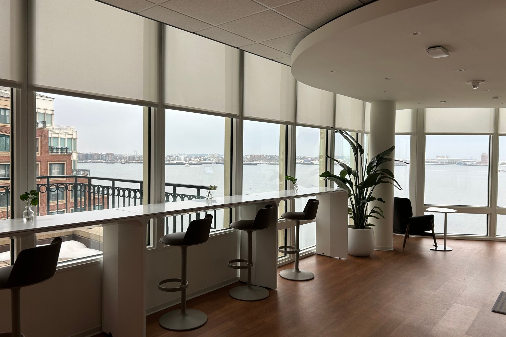 Highrise Consolidated Services completed interior painting and wallcoverings for Great Gray’s office space at 40 Rowes Wharf, spanning the 4th and 5th floors. In a glass-lined, highly visible workplace—where natural light and harbor views amplify every surface—our team focused on clean lines, consistent finish quality, and crisp transitions across walls, feature areas, and detail zones.